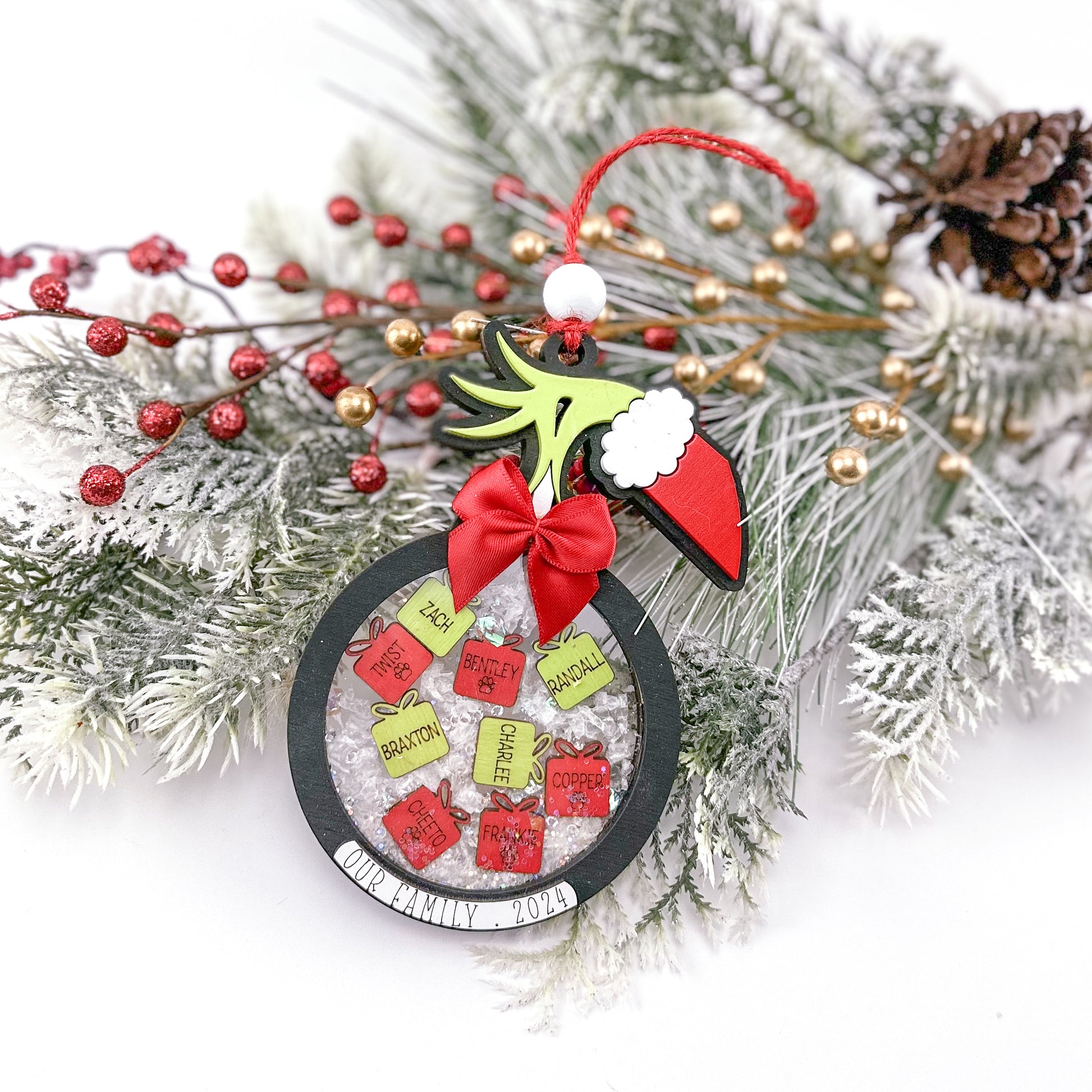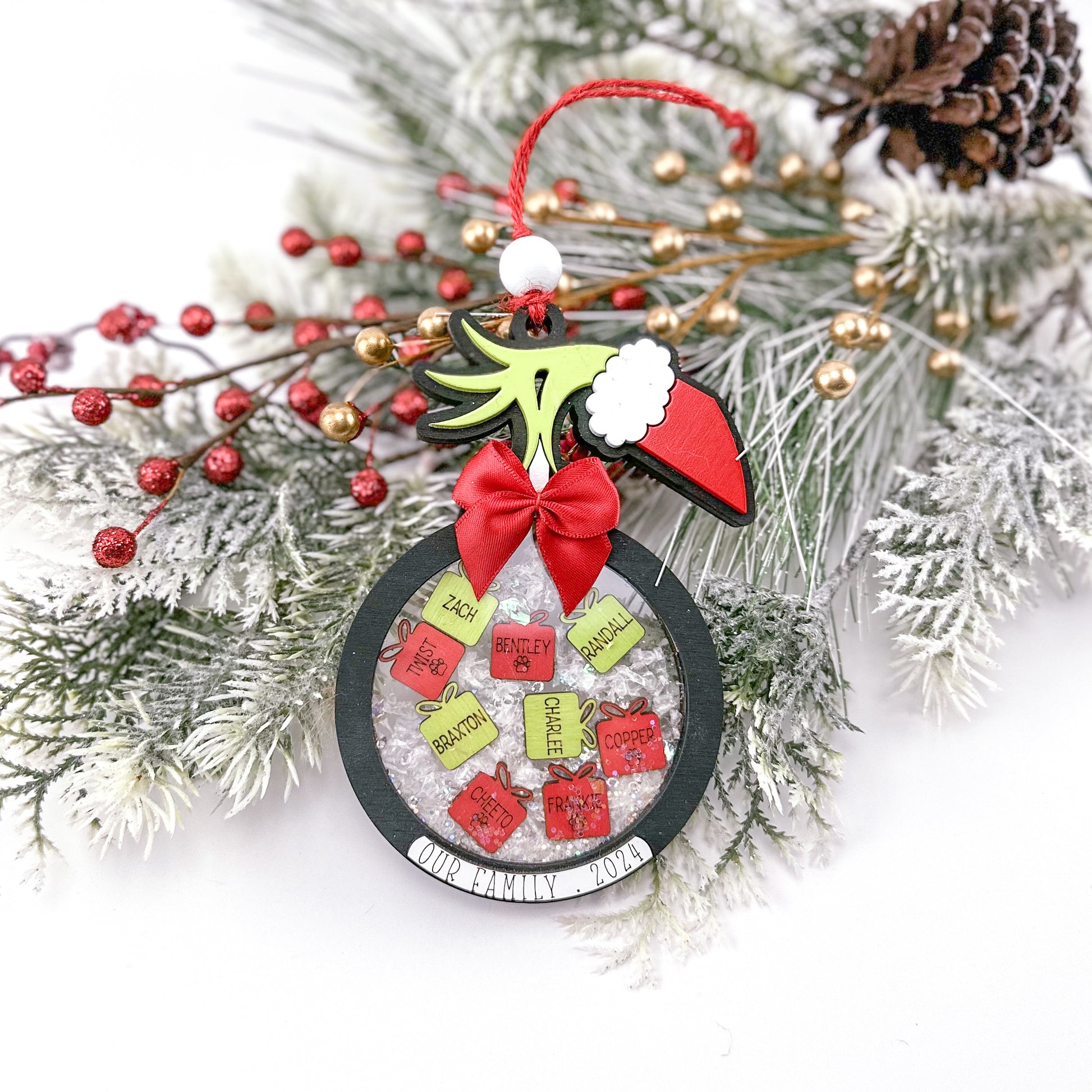 Add a touch of Whoville magic to your tree with this custom Grinchy-inspired ornament, featuring up to 9 family members and even your beloved pets!